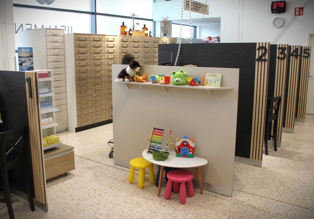 Apteekki toteutettiin pääosin edellisissä toimitiloissa olleilla, vuonna 2018 hankituilla kalusteilla, sekä niihin sovitetuilla uusilla osilla. Suunnittelija Jetta Sihvonen loi yhteistyössä Rönkön ja asentajien kanssa yhtenäisen kokonaisuuden, jossa korostuvat käytännöllisyys ja toiminnallisuus.