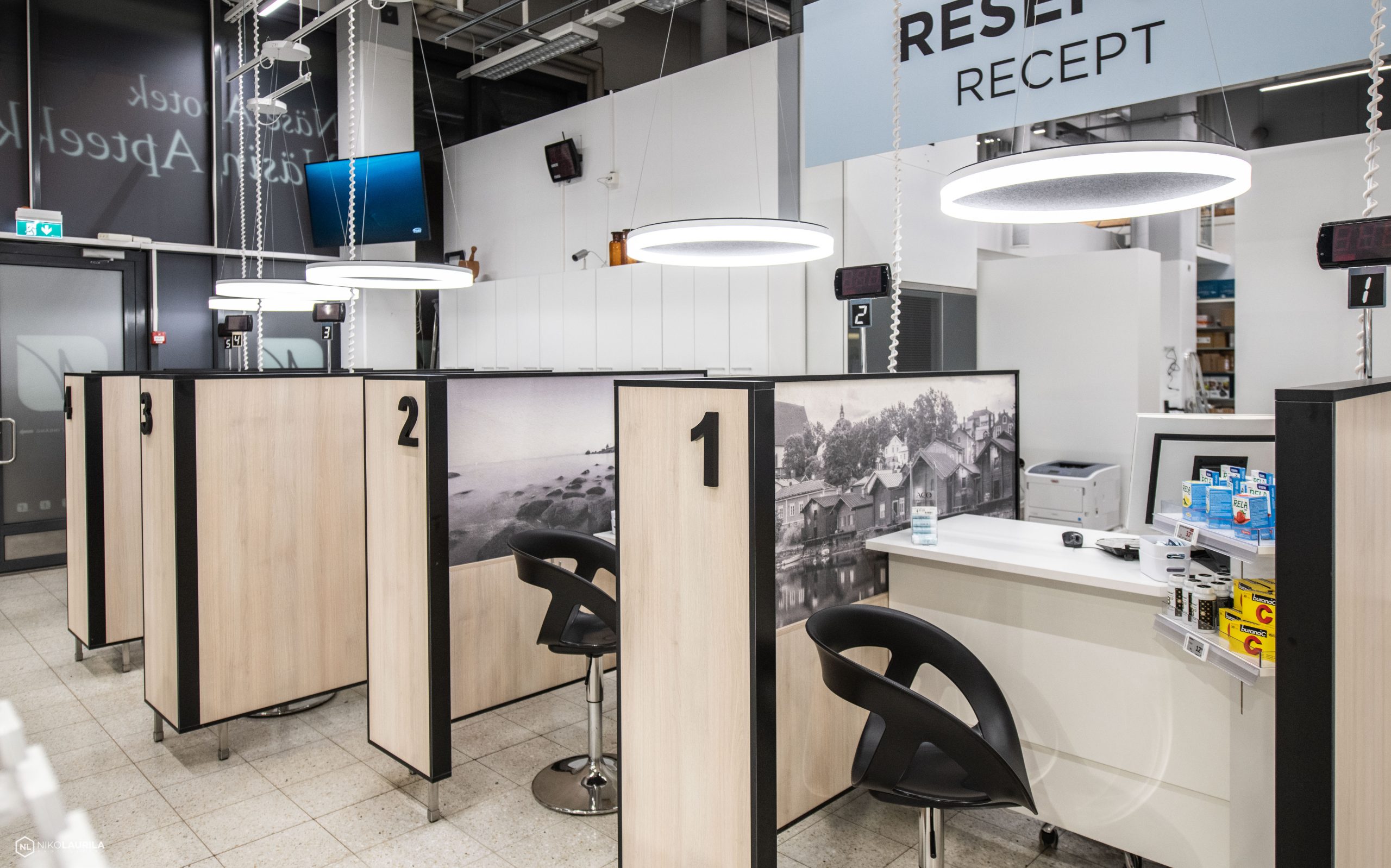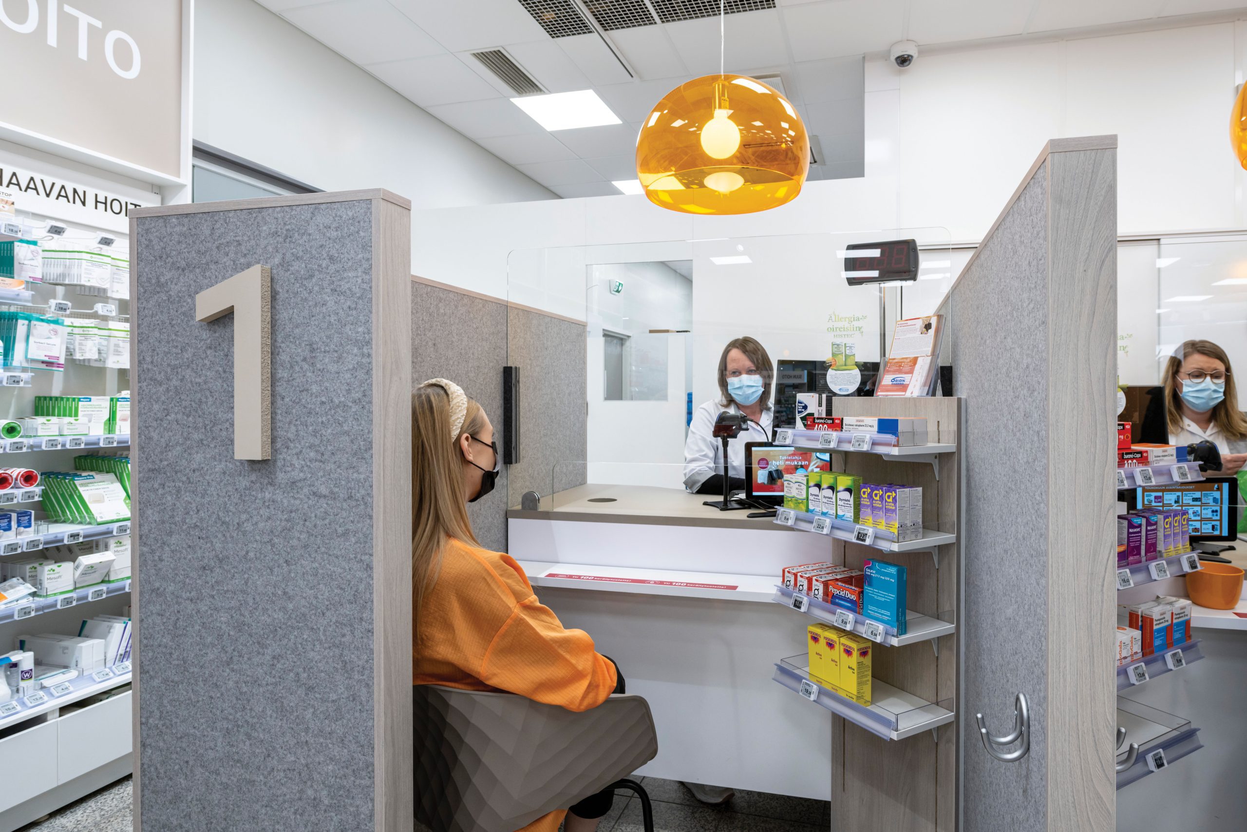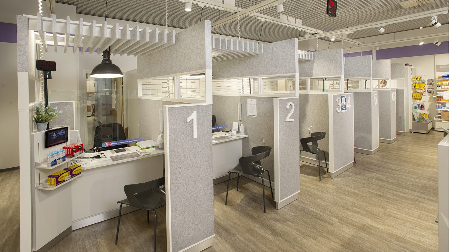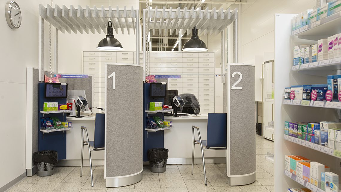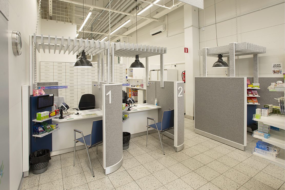 Apteekkikäyttöön suunnittelemamme tyylikkäät akustiikkakatokset ja -tiskit antavat asiakkaalle asiointirauhan ja henkilökunnalle ergonomisen työpisteen. Muokkaamme tiskit ja kassapisteet materiaalien ja värityksen avulla aina ilmeeltään yksilölliseksi ja persoonalliseksi – toiveidesi mukaan.