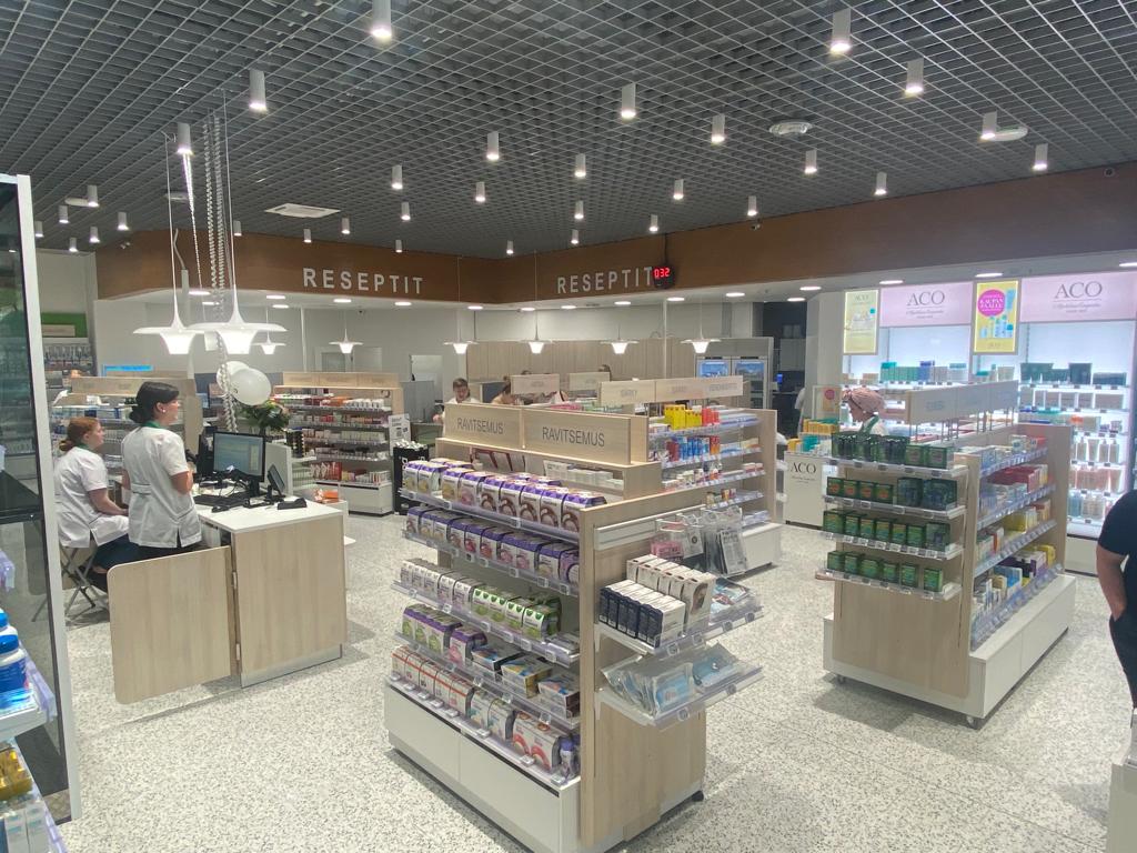 Saukkolan apteekki on kuun vaihteessa uudistunut ihan kokonaan. Paitsi että kaikki kalusteet uusittiin kauttaaltaan, apteekki myös muutti lyhyen matkaa tien toiselta puolelta uusiin juuri valmistuneisiin Salen tiloihin. Samalla kertaa vapautuneita käyttökelpoisia Saukkolan vanhoja kalusteita saatiin kierrätettyä ja hyödynnettyä vielä Sammatinkin sivuapteekissa, joka myös vaihtoi liiketilaa entisisen pankin paikalle. Monta monessa, voisi tästä koko projektista todeta. Tärkeää tietysti on hyvä suunnittelu ja onnistunut projektinjohto, jotta kaikki toiminnat saadaan pelaamaan kahdessa kohteessa saumattomasti yhteen.